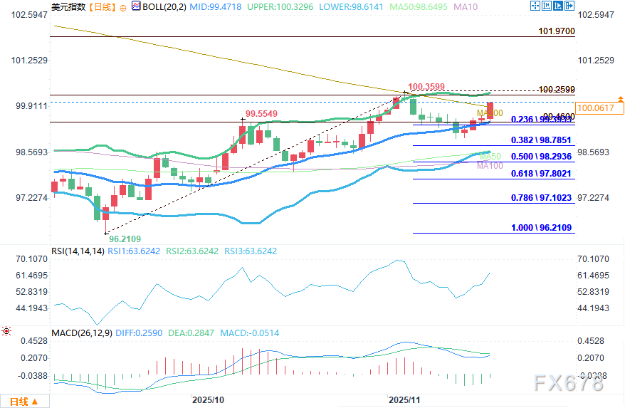 汇通财经APP讯——周三(11月19日)美盘时段,美元指数震荡上行,盘中上破200日均线和100美元重要心理关口。随着11月5日创下的100.360主要高点重新进入视野,市场在美联储10月会议纪要发布前持仓态势趋于稳固。