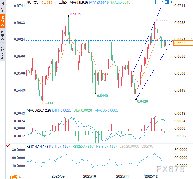 当前澳元/美元正围绕0.6619附近的九日EMA波动。若有效突破该水平将强化短期上行动能,打开通往三个月高点0.6685的通道,进而挑战2025年9月17日以来最高位0.6706。